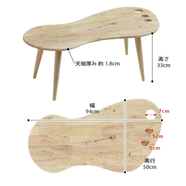 サイズ 本体:約 幅94cm × 奥行50cm × 高さ 33cm 天板厚さ:約1.8cm 重量 約 4.5kg 耐荷重 約 15kg 材質 天然木(ラバーウッド 表面加工 ラッカー塗装 生産国 マレーシア 備考 組み立て品(脚の取り付け) 商品の性質上、木目・色調は商品によりばらつきがあり、イメージ写真と異なる場合があります。